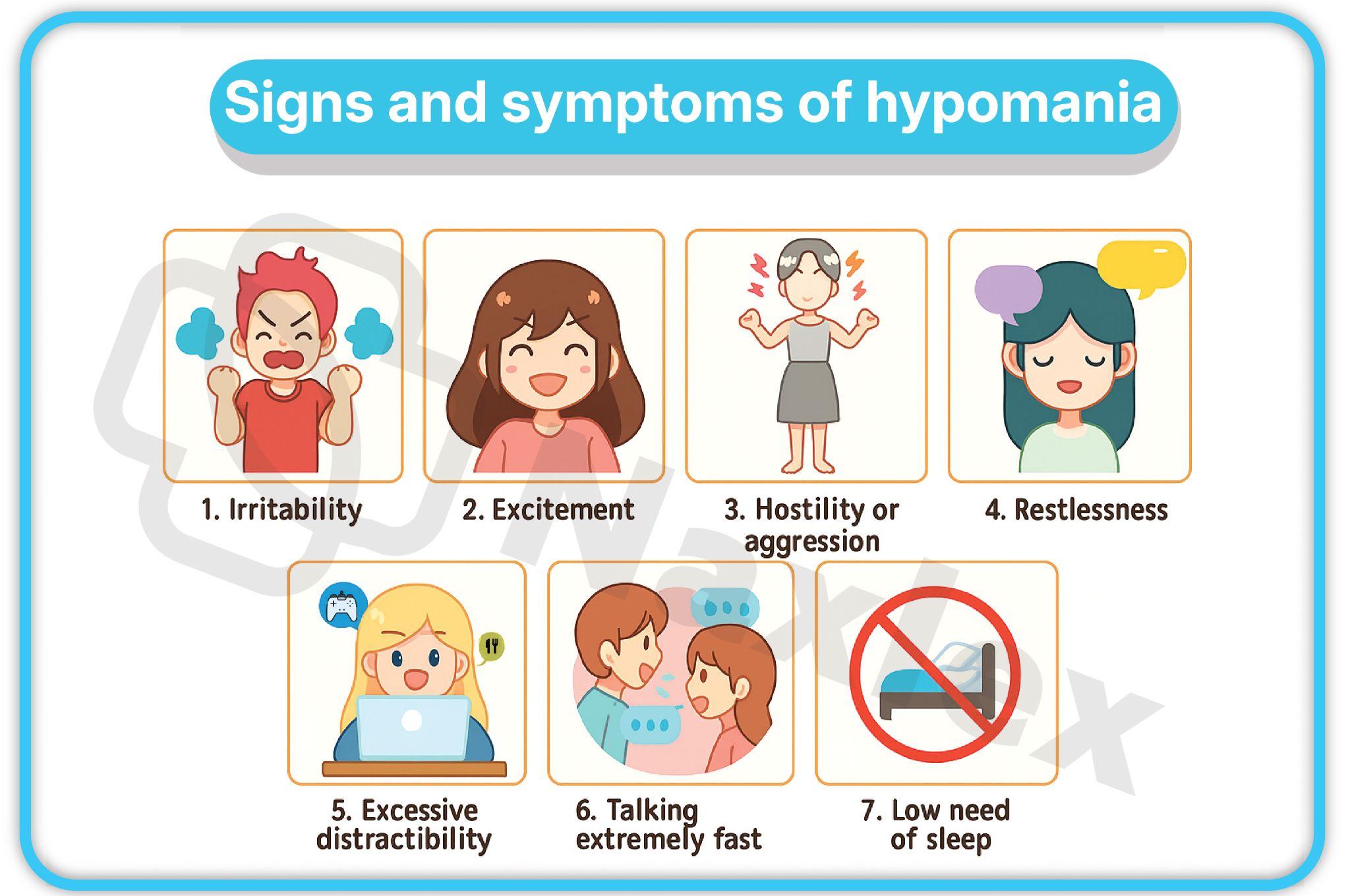 - Hypomania is less severe than mania and does not cause significant functional impairment.