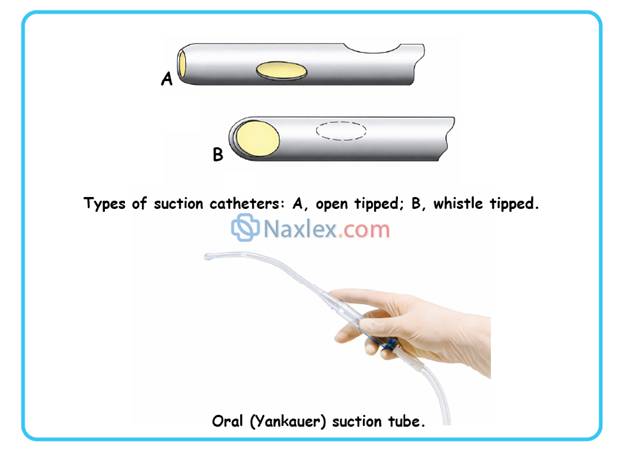 SKILL: OROPHARYNGEAL, NASOPHARYNGEAL, AND NASOTRACHEAL SUCTIONING Clinical preparation and orientation Verification: Confirm patient identity via institutional protocol. Education: Inform the patient that suctioning relieves respiratory distress but may trigger the cough, gag, or sneeze reflex. Infection Control: Perform hand hygiene and adhere to Standard Precautions. Privacy: Provide appropriate draping and environment. Patient positioning Conscious Patient (Functional Gag Reflex): Oral Suctioning: Semi-Fowler’s with head turned to one side. Nasal Suctioning: Semi-Fowler’s with neck hyperextended. Rationale: Facilitates catheter advancement and prevents aspiration. Unconscious Patient: Lateral position facing the clinician. Rationale: Prevents the tongue from obstructing the catheter and facilitates pharyngeal drainage. Equipment settings and general rules Suction Pressure: Use the lowest negative pressure required to clear secretions. Rationale: Excessively high pressure can cause the catheter to adhere to the tracheal wall, resulting in mucosal trauma or irritation. Insertion Rule: Never apply suction during insertion. Total Duration: Limit total suctioning time to 5 minutes. Specific implementation by route Oral and oropharyngeal suctioning Gloves: Clean gloves are sufficient. Lubrication: Moisten the Yankauer or catheter tip with sterile water or saline. Technique: Advance the catheter 10 to 15 cm (4 to 6 in.) along the side of the mouth to the oropharynx. Rationale: Sideward placement minimizes stimulation of the gag reflex. Nasopharyngeal and nasotracheal suctioning Gloves: Sterile technique is required. Use a sterile glove for the dominant hand (to handle the catheter) and a clean glove for the nondominant hand (to handle the suction port). Lubrication: Use water-soluble lubricant to reduce friction and mucosal trauma. Insertion: Advance the catheter along the floor of the nasal cavity to avoid the nasal turbinates. Do not force against obstructions.