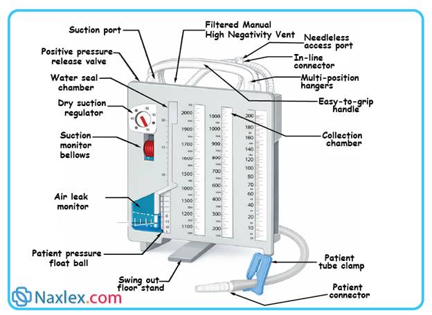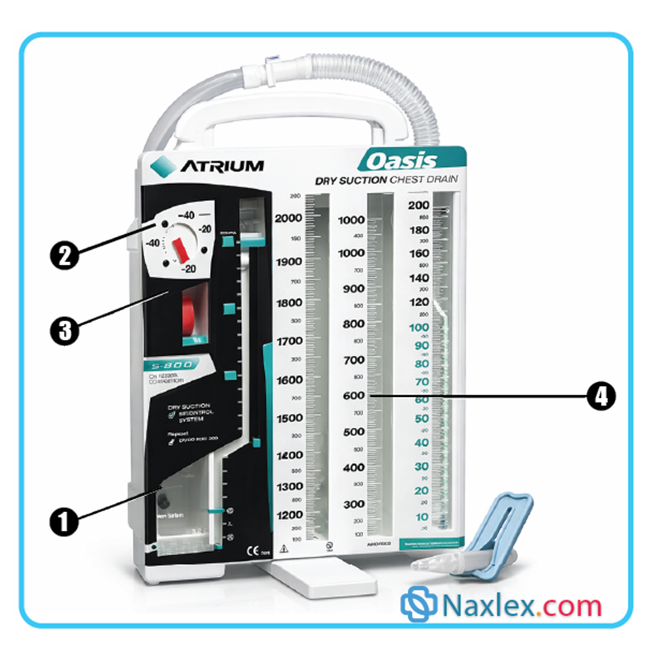 - Water-seal chamber: One-way valve that allows air to exit the pleural space during exhalation but prevents atmospheric air from entering during inhalation.