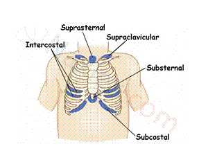 Mild: Intercostal only. Severe: Multiple areas, including supraclavicular/suprasternal. Indicates significant respiratory effort. |