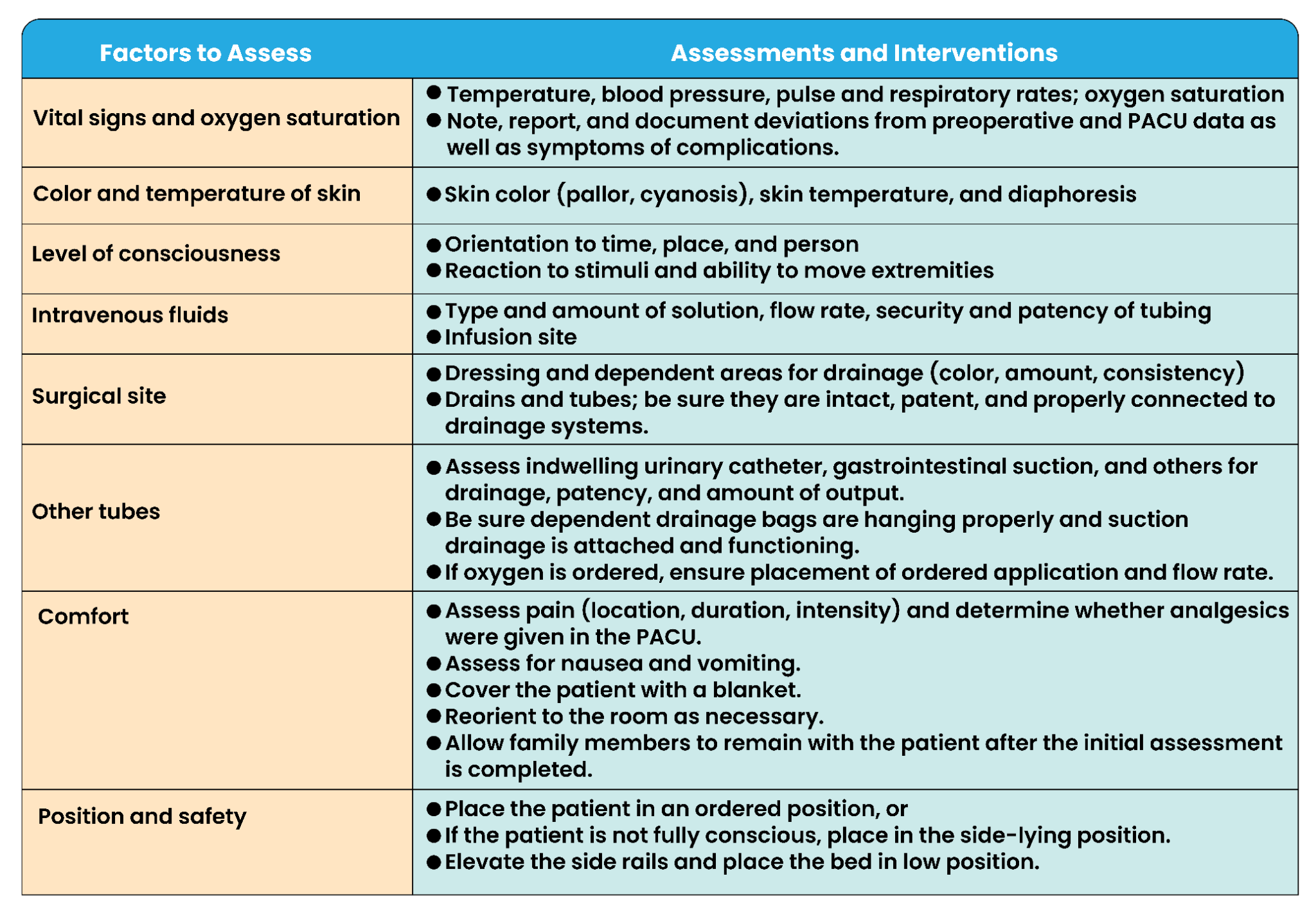 The nurse on the unit assists PACU personnel in transferring the patient to the bed in the unit and makes an initial assessment using data from the preoperative and intraoperative phases. A postoperative checklist or flow sheet may be used.