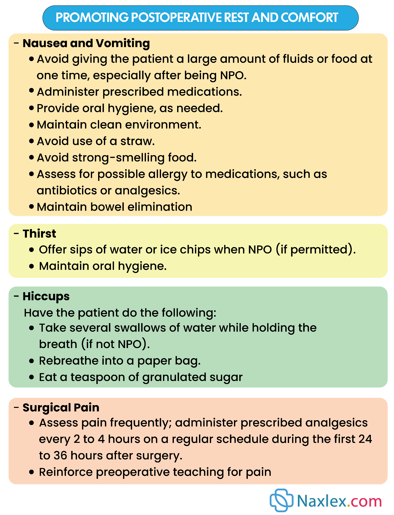 NURSING INSIGHTS: PROMOTING POSTOPERATIVE REST AND COMFORT Nausea and Vomiting Avoid giving the patient a large amount of fluids or food at one time, especially after being NPO. Administer prescribed medications. Provide oral hygiene, as needed. Maintain clean environment. Avoid use of a straw. Avoid strong-smelling food. Assess for possible allergy to medications, such as antibiotics or analgesics. Maintain bowel elimination