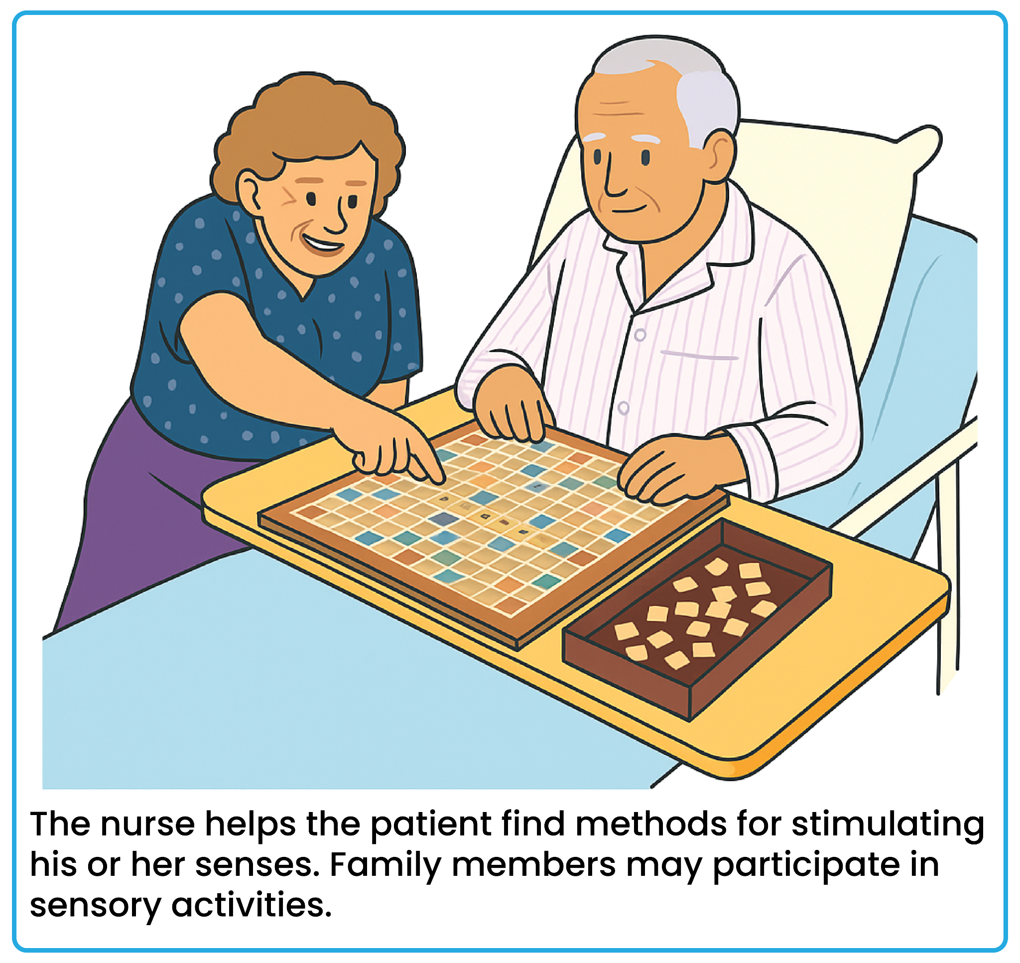 - If patient has problems speaking, ask questions that require simple yes-or-no answers or blinking of the eyes. Offer pictures or a communication board so patient can point.