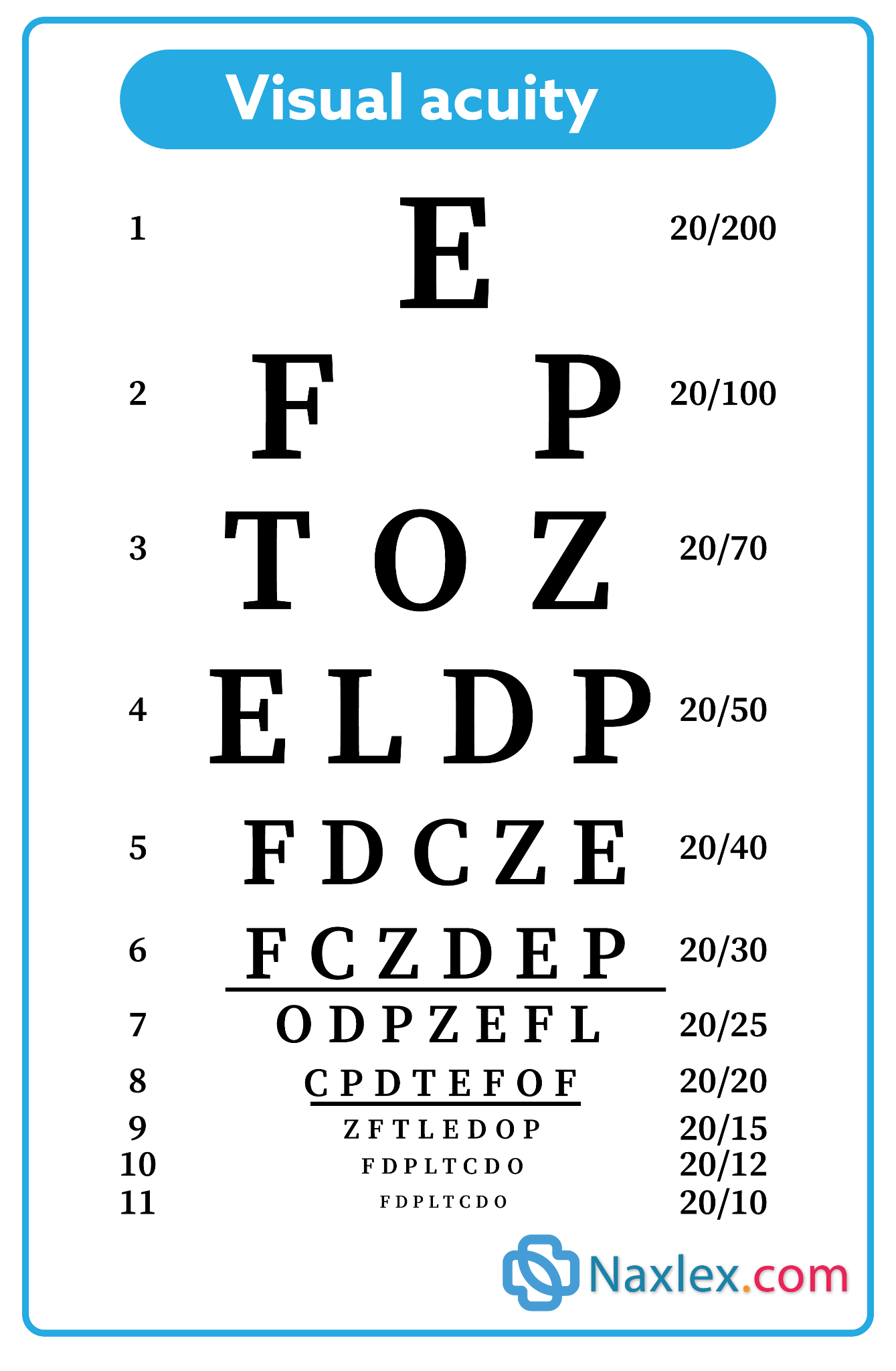 Snellen chart → Visual (1): The Snellen chart measures visual acuity by having clients read letters at a distance, assessing cranial nerve II (optic nerve).