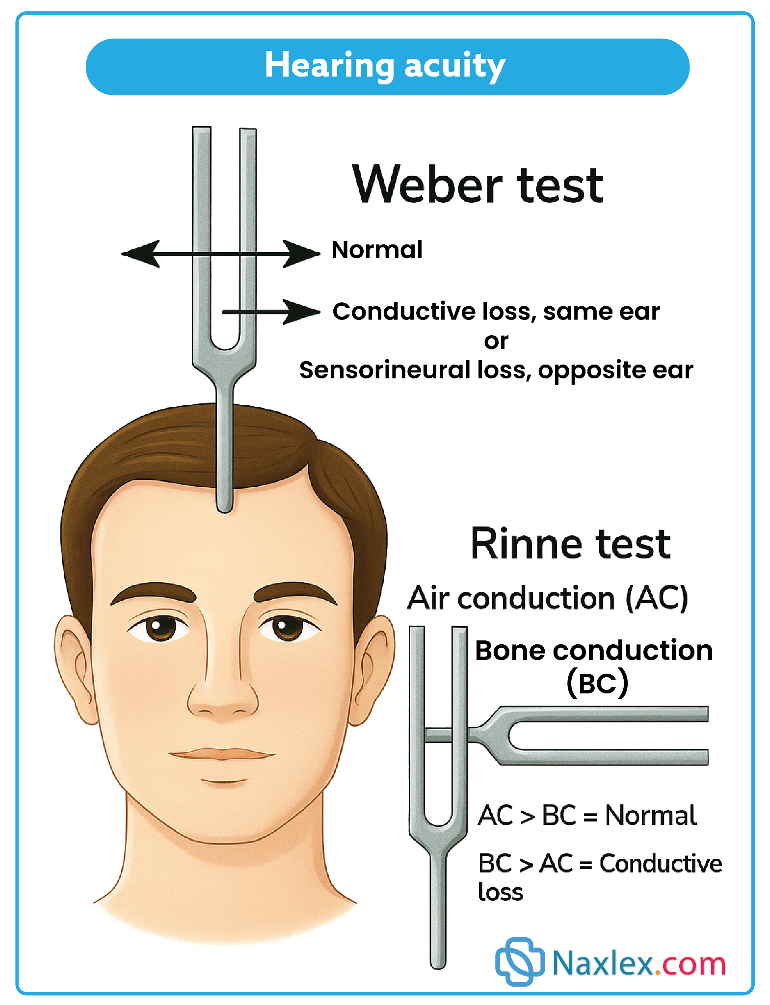 Tuning fork → Hearing (2): A tuning fork is used for auditory assessments such as the Rinne or Weber test, which evaluate air and bone conduction and test cranial nerve VIII (vestibulocochlear).