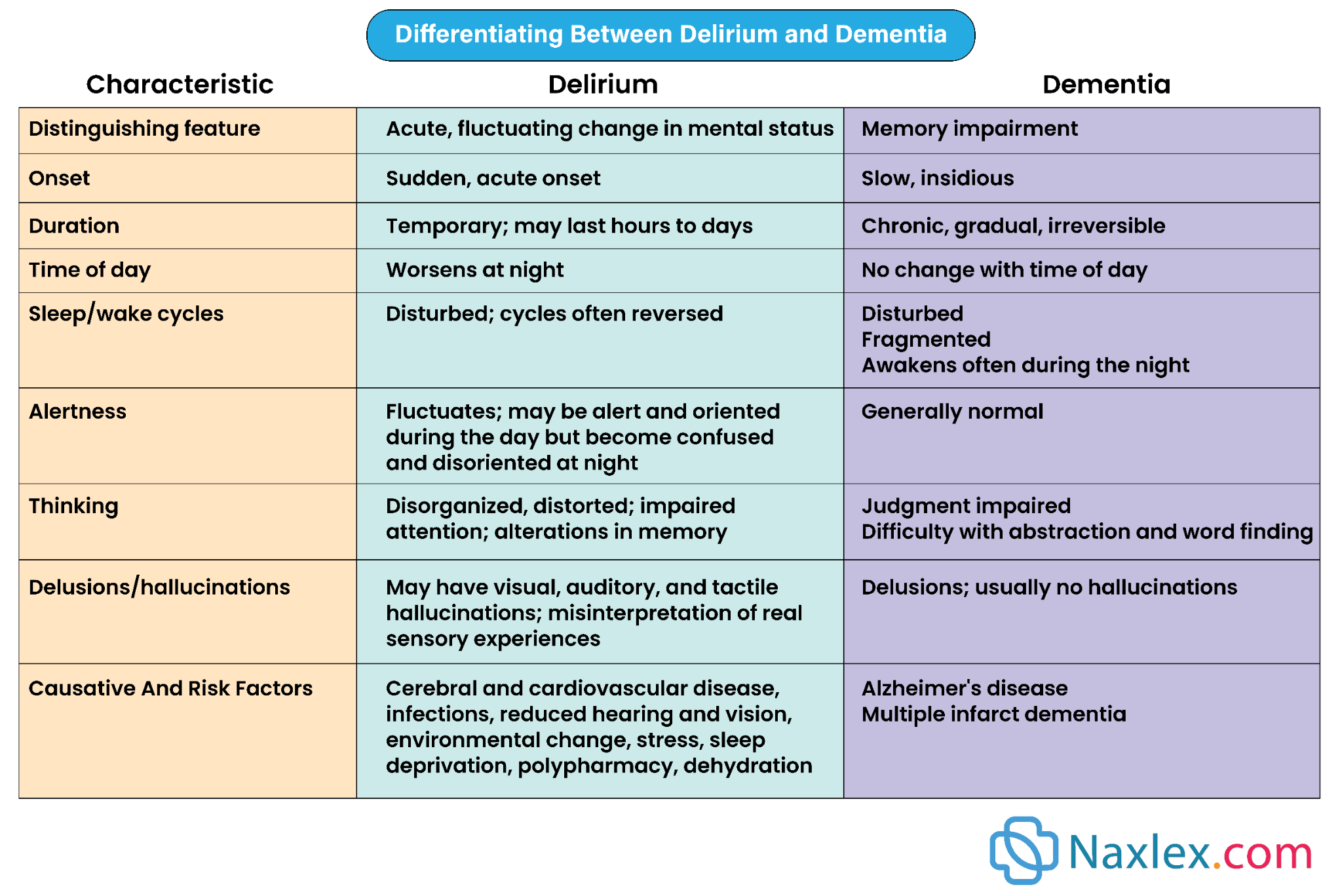 - Delirium: Medical term, common in older adults, especially post-surgery (≈40%).