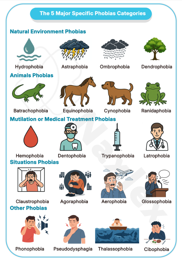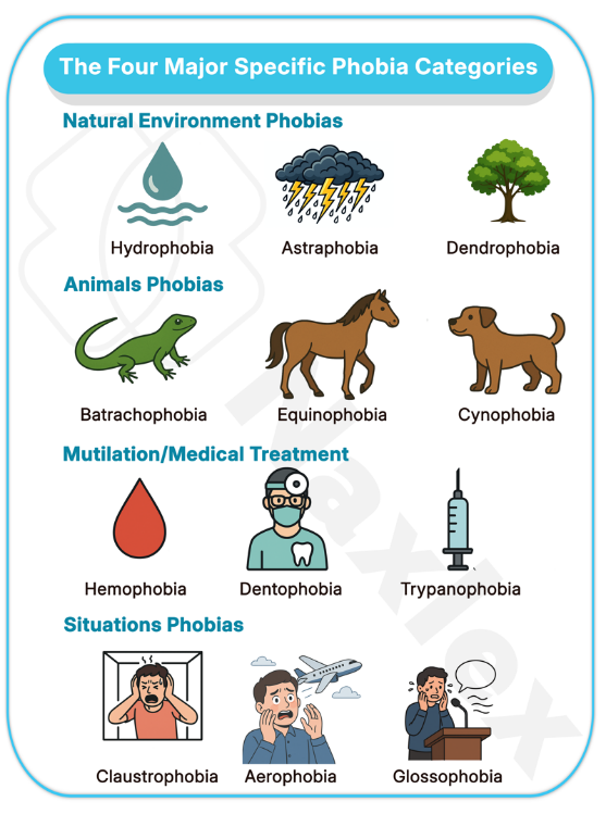 - The nurse must be adept at recognizing the diverse types of specific phobias, from acrophobia to hematophobia, and understanding their unique clinical presentations.