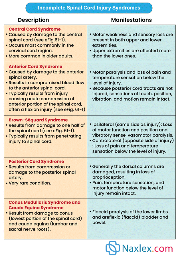 - Differentiation from other incomplete cord syndromes is based on motor and sensory patterns.