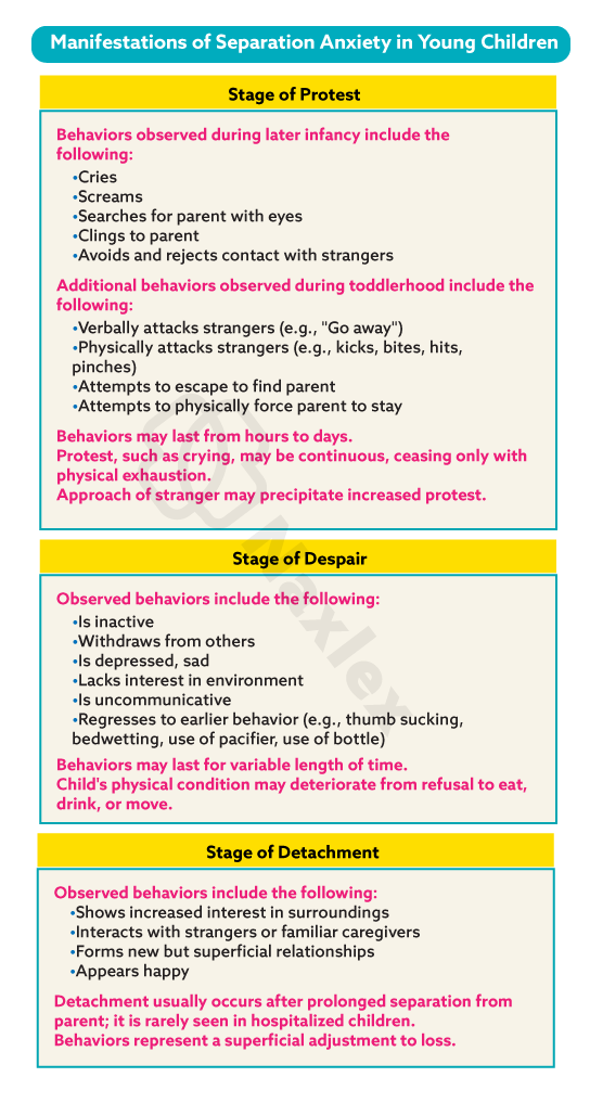 - Toddlers: separation anxiety shows in protest–despair–detachment stages.