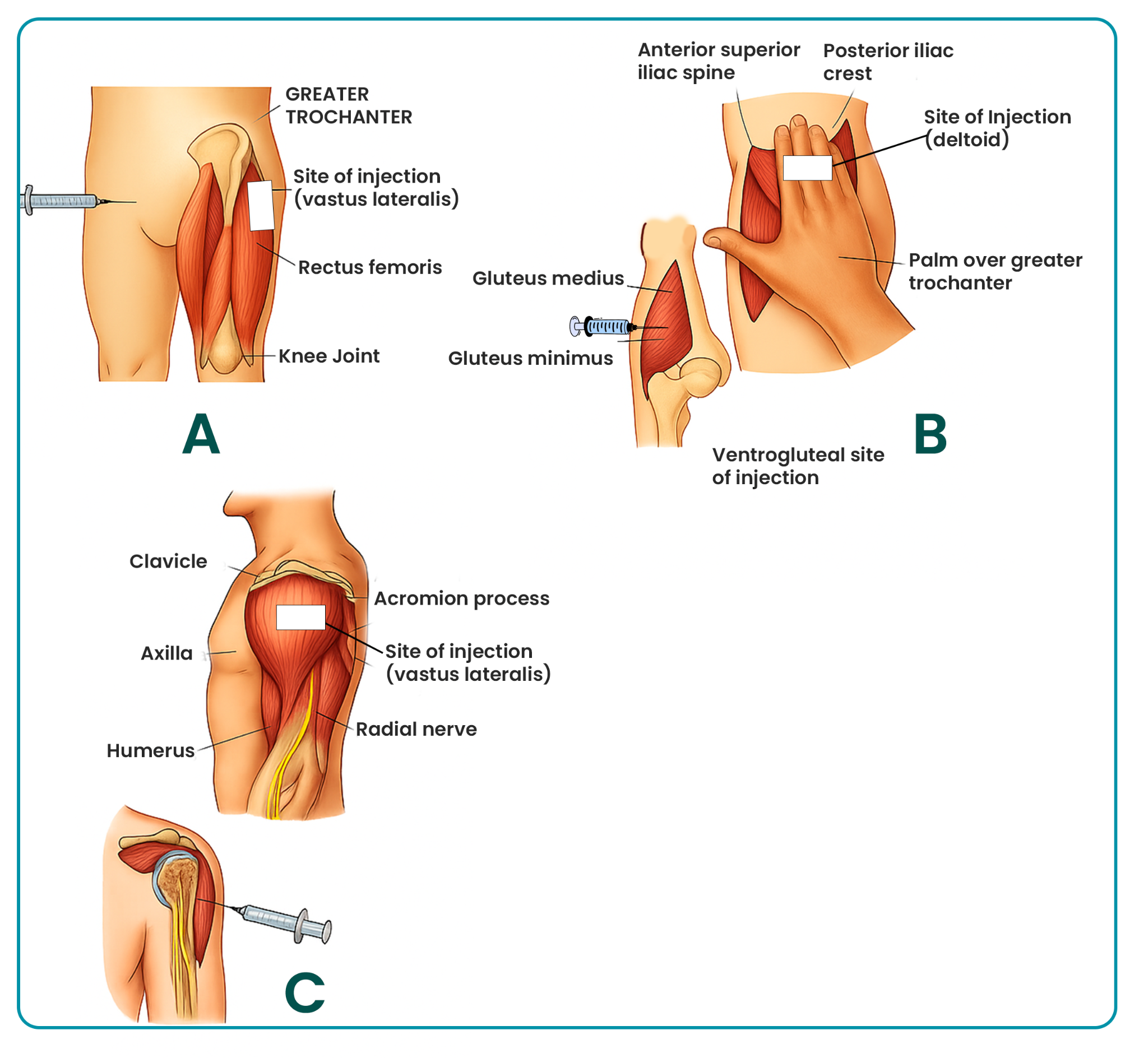 - Vastus lateralis. B. Ventrogluteal. C. Deltoid