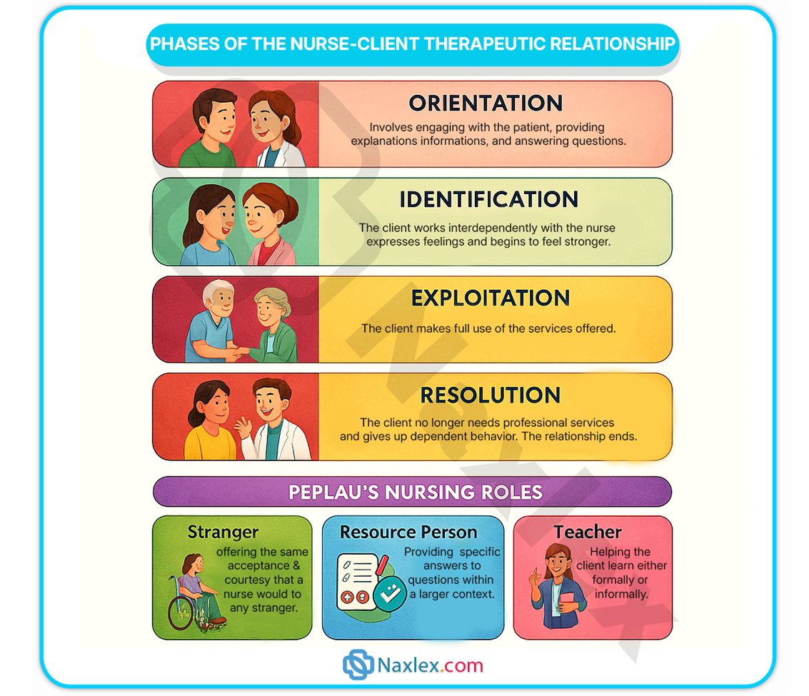 - Peplau’s phases—pre-interaction, orientation, working, and termination—guide the development of therapeutic relationships.