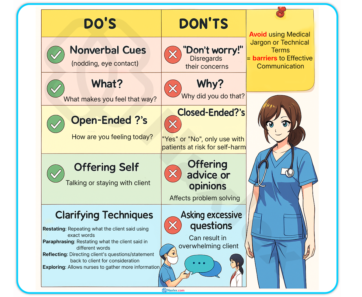 - Empathetic response: The nurse reflects the client's feelings back to them to encourage expression.