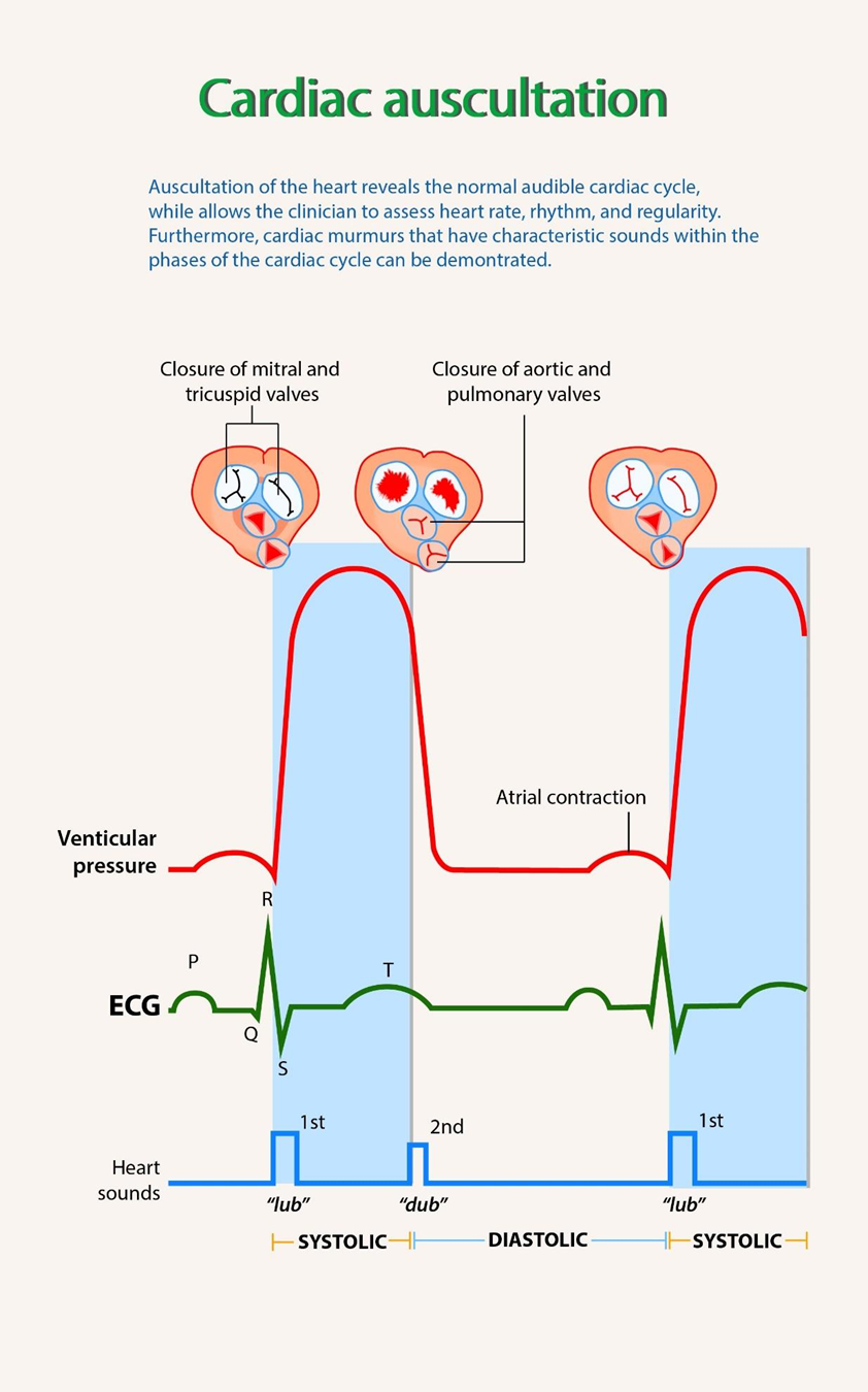 Choice B reason: While S1 and S2 are considered expected heart sounds, turbulence audible during the systolic phase is considered an adventitious sound. An expected or normal heart examination typically involves clear, crisp valvular closures without audible swishing or blowing sounds, which indicate abnormal blood flow patterns.