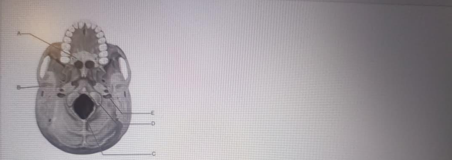 A. Palatine Bone: This region forms the bony roof of the mouth and the floor of the nasal cavity, providing a structural barrier between the oral and nasal passages. It is located at the most anterior portion of the skull's inferior view and is essential for mechanical digestion and speech.