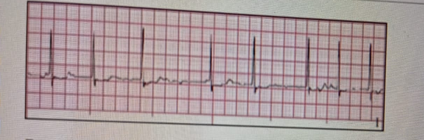 C. Atrial fibrillation (A-fib): Atrial fibrillation is characterized by irregularly irregular R-R intervals, chaotic atrial activity with no discernible P waves, and a variable ventricular rate. This strip clearly shows discernible P waves.
