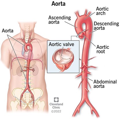 It originates from the left ventricle of the heart and extends down to the abdomen, where it splits into two smaller arteries (the common iliac arteries).
