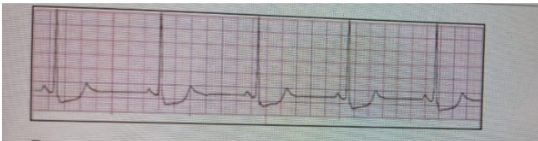 C. Atrial fibrillation (A-fib): Atrial fibrillation is characterized by irregularly irregular R-R intervals, chaotic atrial activity with no discernible P waves, and a variable ventricular rate. This strip clearly shows discernible P waves.