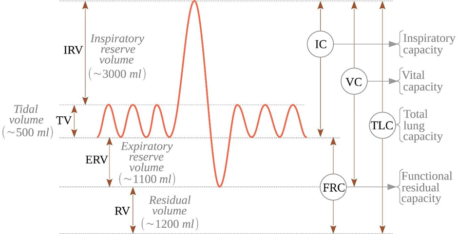 inspiratory reserve volume, tidal volume, and expiratory reserve volume.