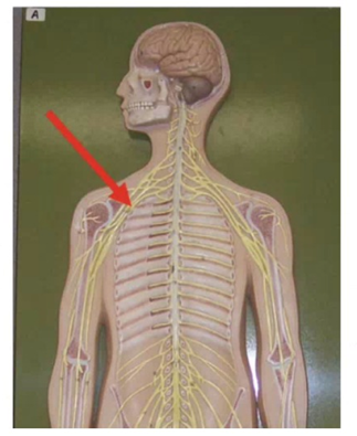 A. Central Nervous System (CNS): The CNS consists of the brain and spinal cord only. Since the arrow points to a nerve in the shoulder region, this is outside the CNS.