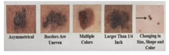 C. Melanoma: This is the most severe and deadly form of skin cancer because it is highly likely to spread to other organs. The image displays the classic warning signs: Asymmetry, irregular Borders, multiple Colors, large Diameter, and Evolving/Changing.
