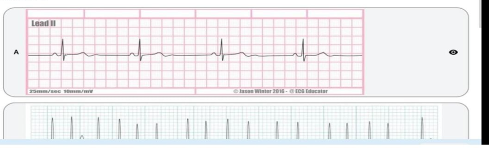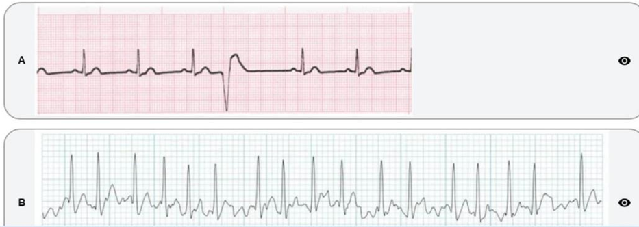 A. The rhythm strip shown in A exhibits a regular underlying rhythm interrupted by a Premature Ventricular Contraction (PVC), which is a wide, bizarre QRS complex occurring earlier than expected. While PVCs can cause palpitations, they do not typically present as a sustained "rapid, irregular" heart rate with a total absence of P-waves across the entire strip.