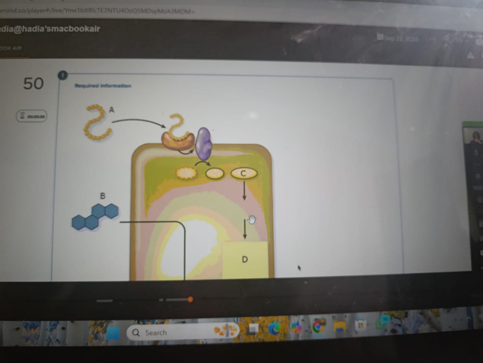 D. CAMP: Cyclic AMP (cAMP) is a common second messenger produced by adenylate cyclase after many peptide hormones bind cell-surface receptors; the diagram’s small oval (C) inside the cytoplasm leading to downstream effects (D) fits cAMP.