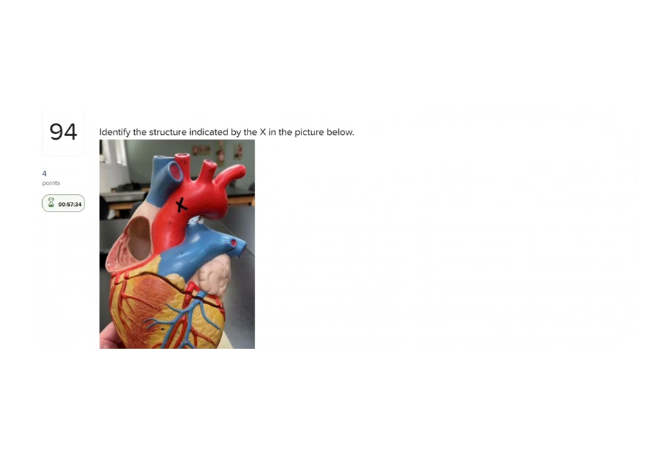 The structure marked X is the aorta, the large artery emerging from the left ventricle that distributes oxygenated blood to the systemic circulation.