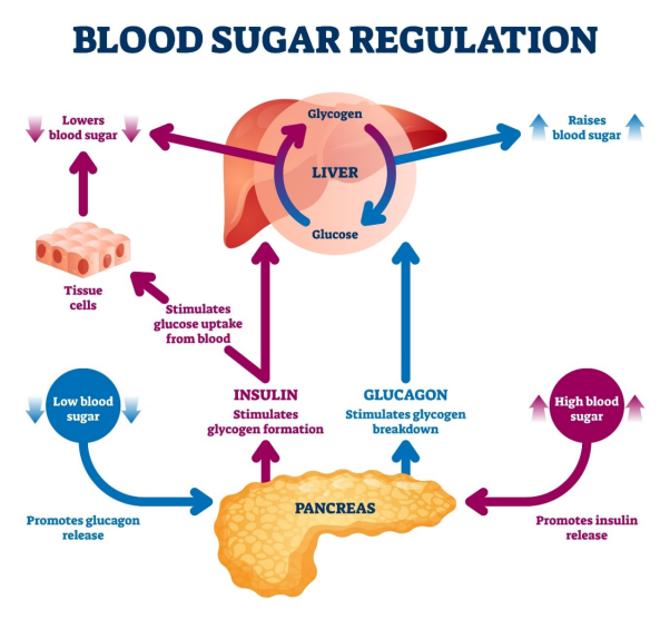 C. The regulation of blood glucose levels by insulin and glucagon:Negative feedback works to reverse a deviation from the set point. If blood glucose rises, insulin is released to lower it. If blood glucose drops, glucagon is released to raise it. The system works to negate the stimulus (high or low sugar) to maintain balance.