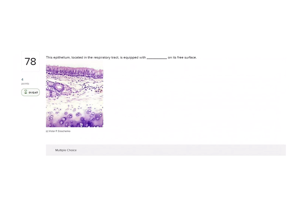 B. Cilia: Respiratory epithelium (pseudostratified ciliated columnar) is equipped with cilia on its free surface to move mucus and trapped particles