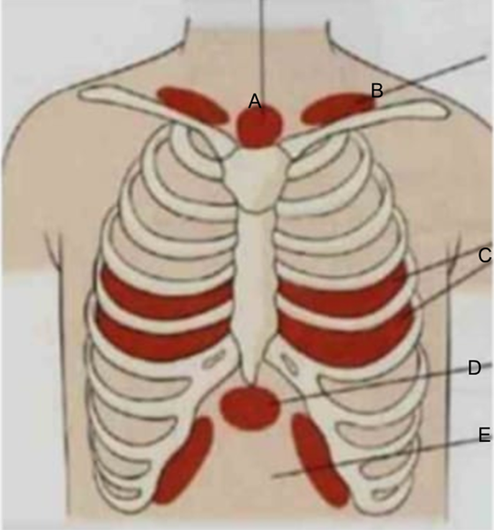 The nurse is caring for a child in respiratory distress who is experiencing substernal retractions. Select the red area where SUBSTERNAL retractions occur.