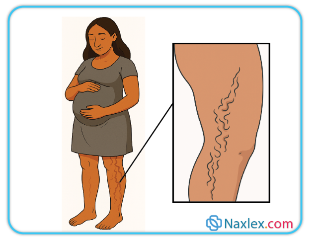 Nursing Insights: Nurses should monitor for signs of thrombophlebitis or DVT in patients with varicose veins, as pregnancy increases thrombotic risk. Educating patients on the use of compression stockings and leg elevation is critical to reducing discomfort and preventing progression of venous insufficiency.