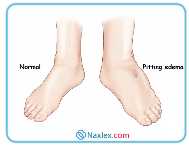 - Assess the extent and location of edema, typically in the ankles and feet, using a grading scale (1+ to 4+).