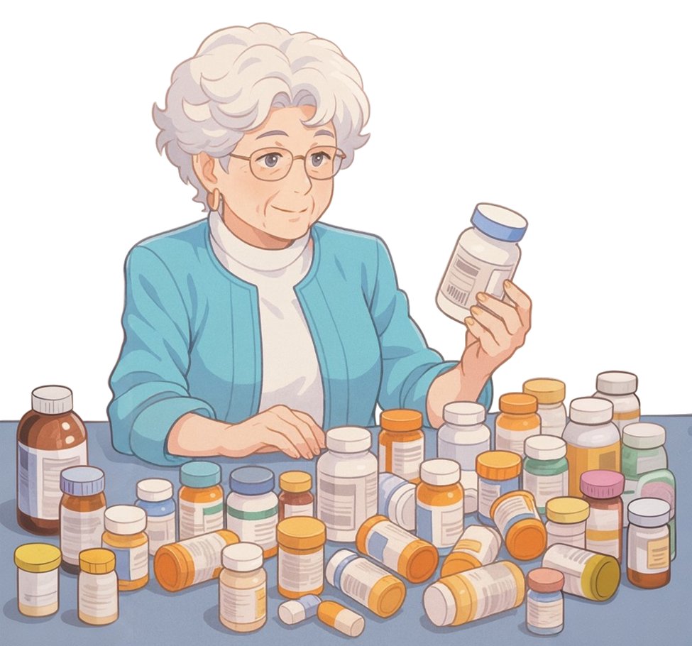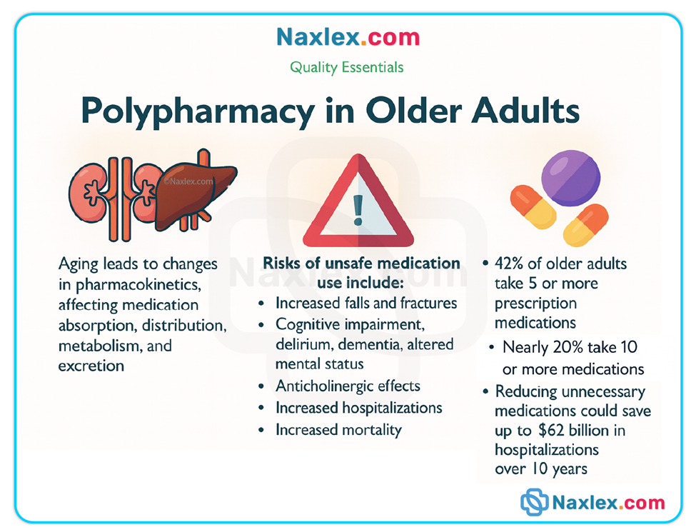 - Older adults frequently take multiple medications prescribed by different providers, increasing the risk of drug–drug interactions, duplicate therapies, and adverse events. Regular medication reconciliation (especially at transitions of care) and deprescribing where appropriate reduce risk.