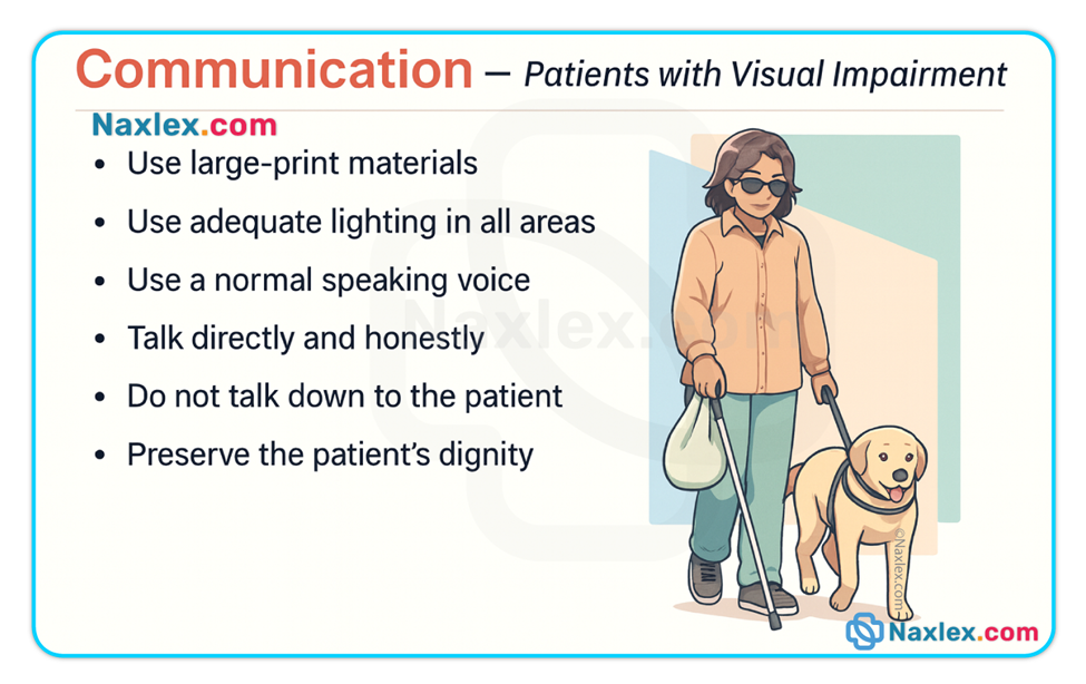 - Face the patient, speak clearly (without shouting), limit background noise, and use written instructions or sign language interpreters when available; document the best method of communication in the chart.
