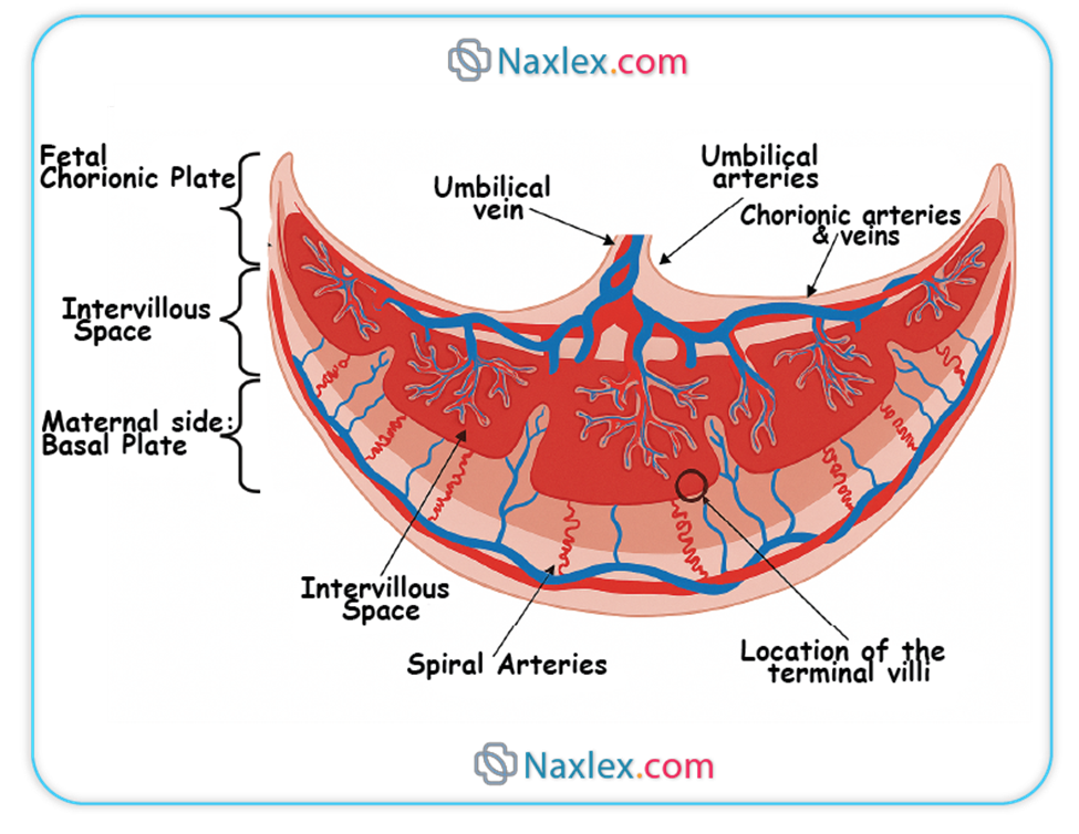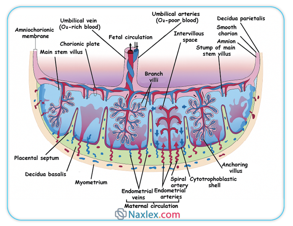 - Maternal blood then bathes the chorionic villi, facilitating exchange.