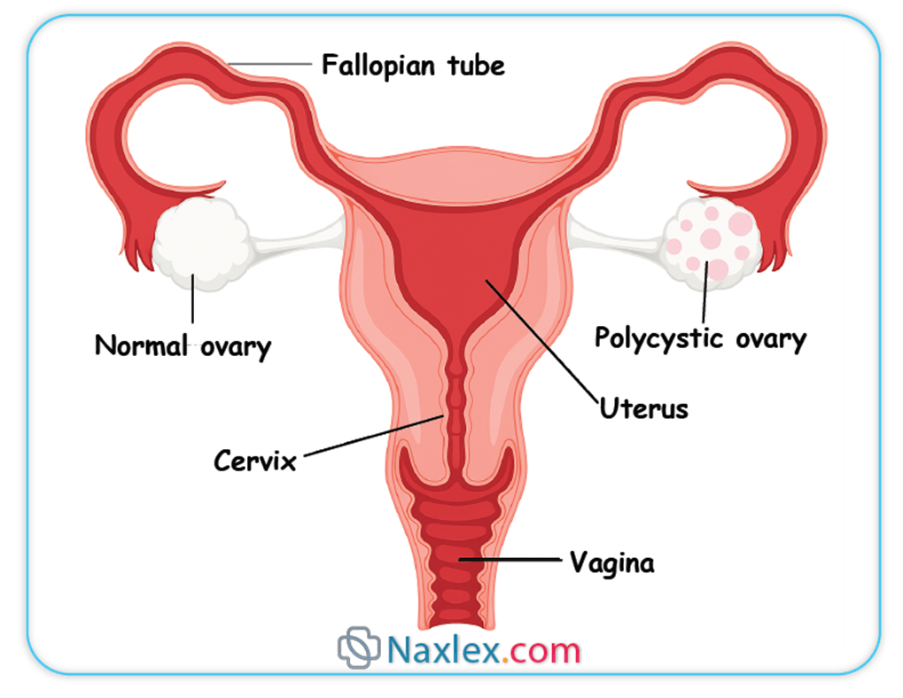 Polycystic ovary syndrome (PCOS)is a common endocrine disorder characterized by chronic anovulation, hyperandrogenism, and polycystic ovarian morphology. It affects approximately 6–10% of reproductive-aged women and is a major cause of infertility. Hallmark features include menstrual irregularities (cycles >35 days), elevated androgens (testosterone >70 ng/dL), and ovarian volume >10 mL or ≥12 follicles per ovary on ultrasound. Insulin resistance, increased LH:FSH ratio (>2:1), and elevated AMH (>4.5 ng/mL) are also common. PCOS increases the risk for type 2 diabetes, metabolic syndrome, and endometrial hyperplasia due to unopposed estrogen.
