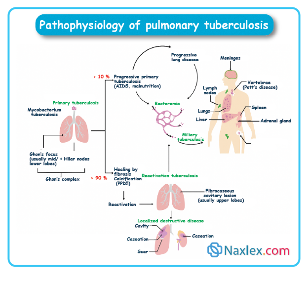 - Primary Progressive TB: Occurs shortly after primary infection, especially in young infants, immunocompromised children, or those with large inoculums.