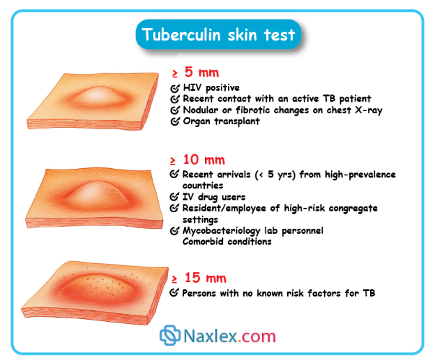 - Interpretation depends on risk factors (e.g., >5mm induration is positive in close contacts, immunocompromised; >10mm in high-risk groups; >15mm in low-risk).