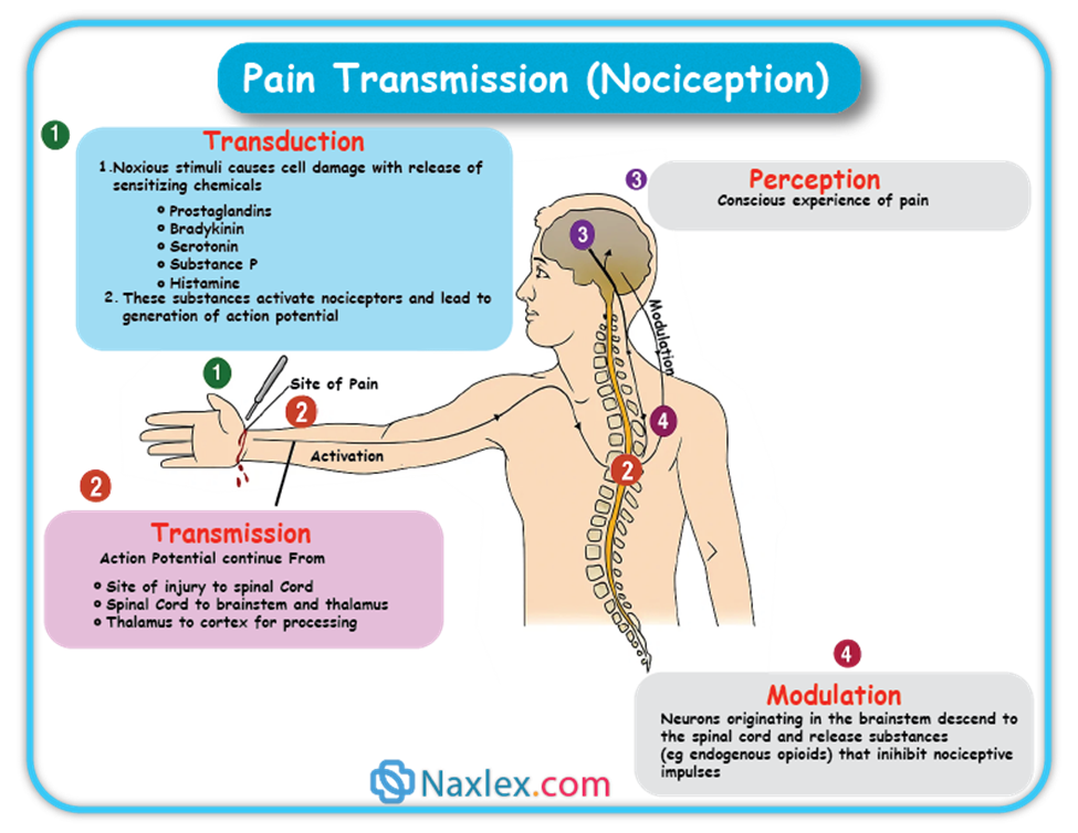 - The Pain Process (Nociception): Pain involves four distinct physiological steps: