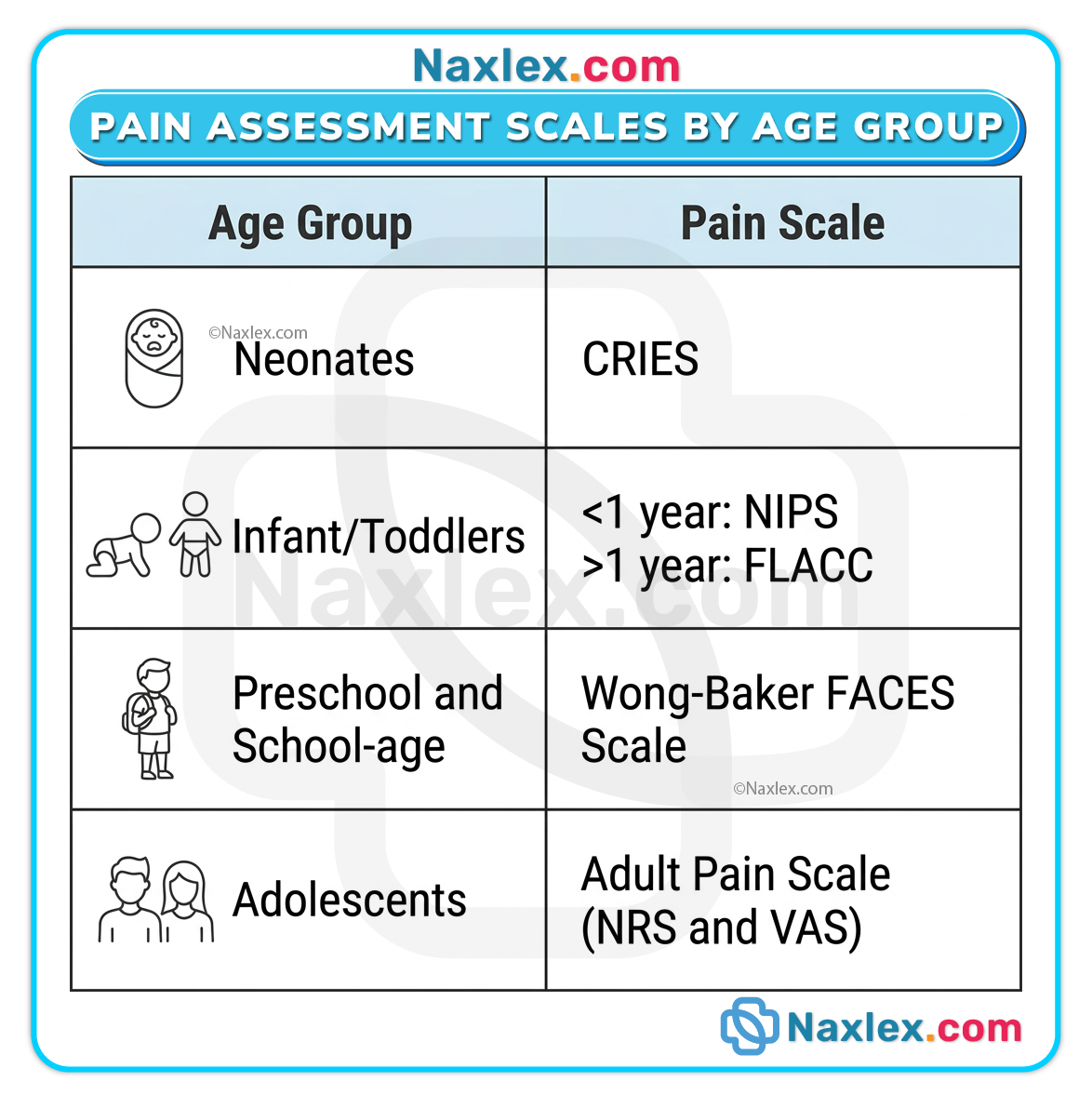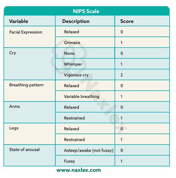 - NIPS Scale: Used for infants up to 1 year. It assesses facial expression, crying, breathing patterns, arm and leg movements, and state of arousal.