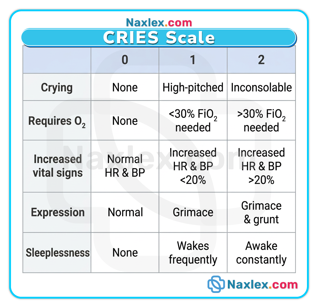 - CRIES Scale: Used for neonates. It assesses Crying, Requires O2​, Increased vital signs, Expression, and Sleeplessness.