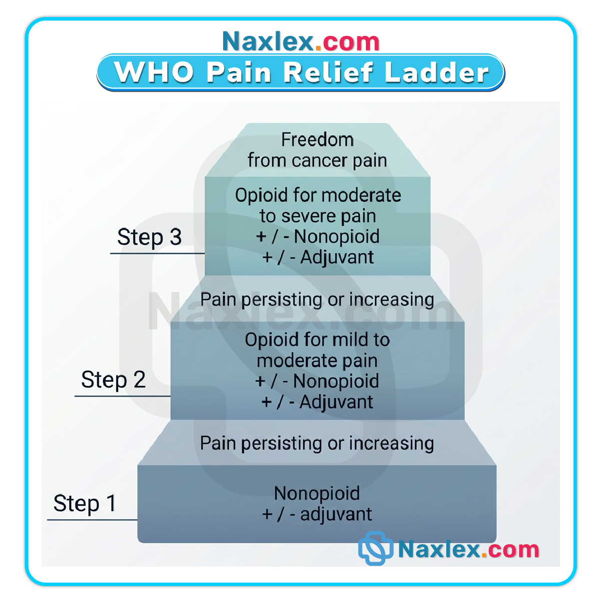 - Pharmacologic management follows the World Health Organization (WHO) pain ladder, starting with non-opioids and escalating as needed.