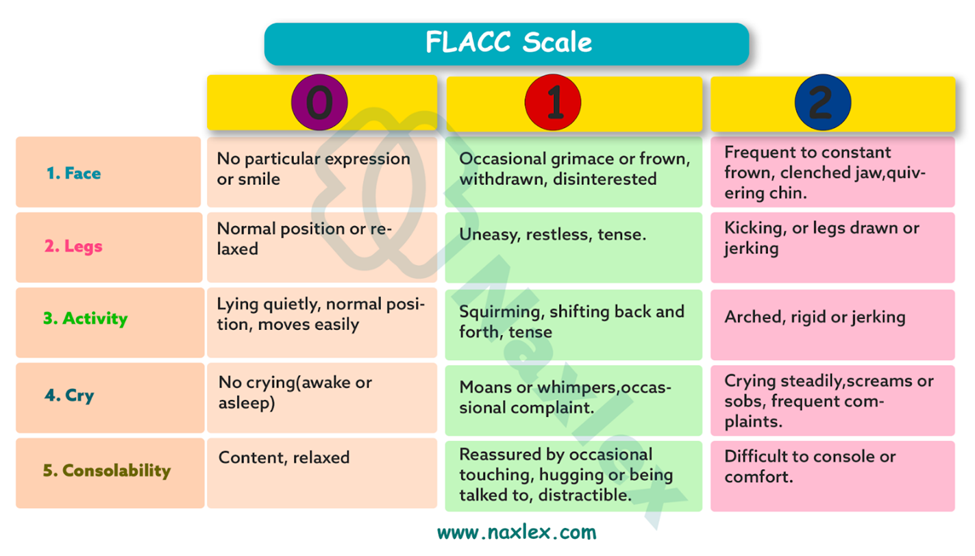 - FLACC Scale: Used for children from 2 months to 7 years. It stands for Face, Legs, Activity, Cry, and Consolability. The nurse rates each category from 0-2, with a total score from 0-10.