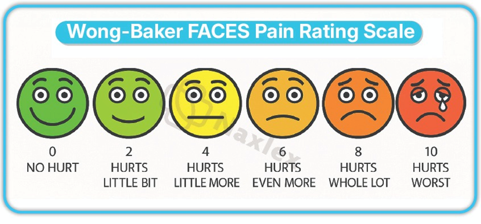 - Wong-Baker Faces Pain Rating Scale: Consists of six faces ranging from a smiling face for "no pain" to a crying face for "worst pain." It is suitable for children as young as 3.