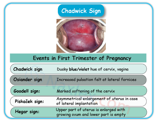 • Chadwick’s Sign: A bluish-purple discoloration of the cervix and vagina, noted around 6-8 weeks, is caused by increased vascularity and venous congestion due to elevated estrogen levels.
