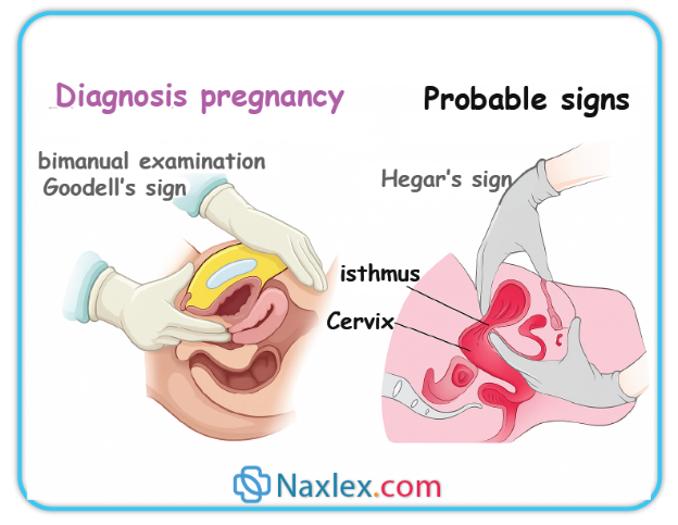 Pregnancy is identified through presumptive, probable, and positive signs, categorized by specificity. Probable signsare objectivefindings observed by clinicians that strongly suggest pregnancy but are not definitive. These include Goodell’s sign, Chadwick’s sign, Hegar’s sign, and a positive pregnancy test. Goodell’s signis the softening of the cervical tipdue to increased vascularization caused by rising estrogen levels. It typically occurs around 6–8 weeksof gestation. Unlike presumptive signs, probable signs are observable and measurable, but still not conclusive without positive confirmation.